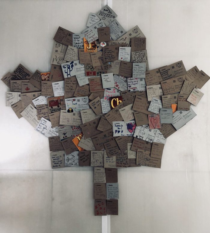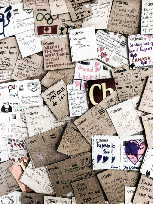 Lorsqu’on est athlète d’Équipe Canada, c’est toute une nation qui est derrière nous. Afin que les membres de l’équipe ne l’oublient jamais, nous avons décoré les aires communes de messages d’encouragement écrits par nos partisans et de cartes de vœux qui avaient été insérées dans les produits General Mills pour que les partisans envoient leurs encouragements.