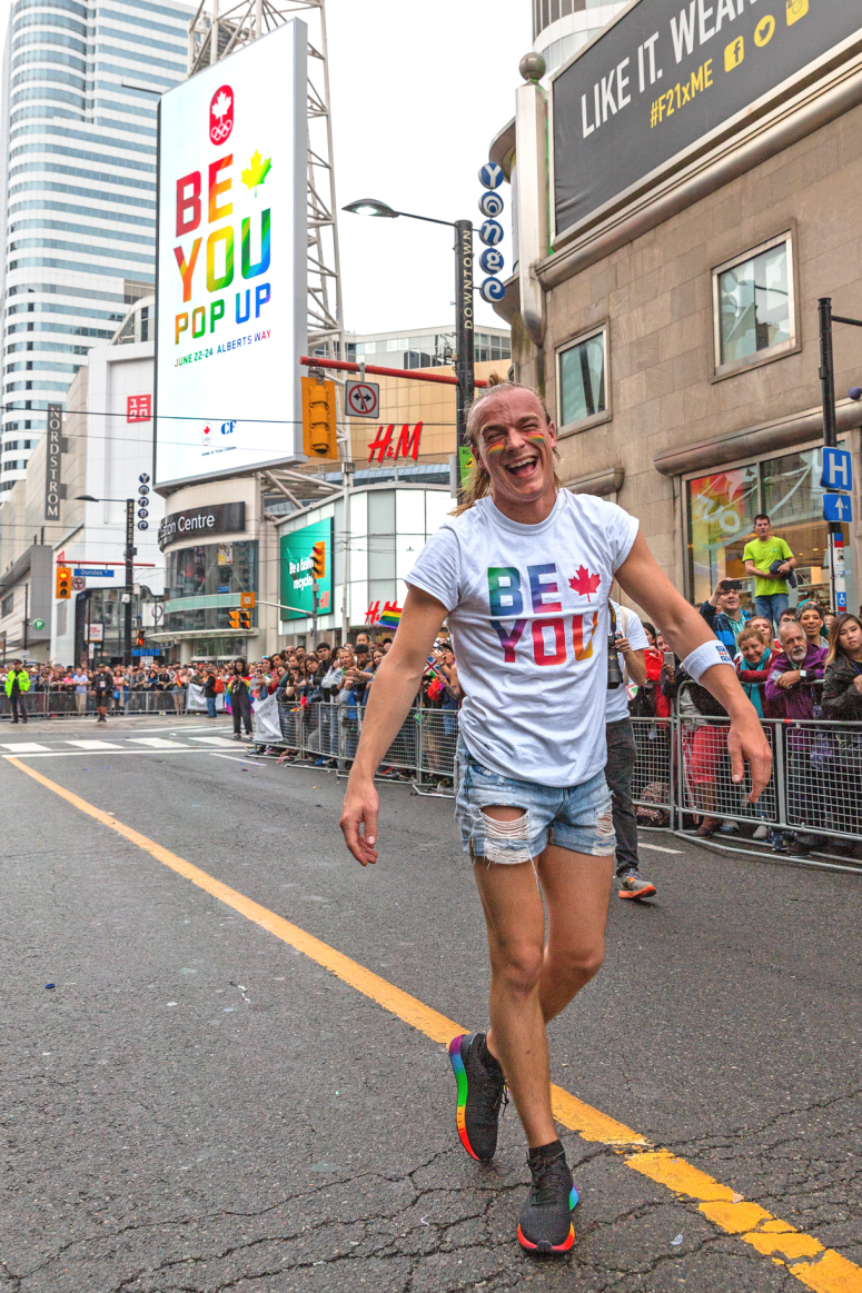 TORONTO (ONTARIO) 25 JUIN : Le Comité olympique canadien est partenaire de l’organisation You Can Play pour célébrer et marcher dans le cadre du Défilé de la Fierté au centre-ville de Toronto, le 25 juin 2017. (Photo par Adam Pulicicchio)