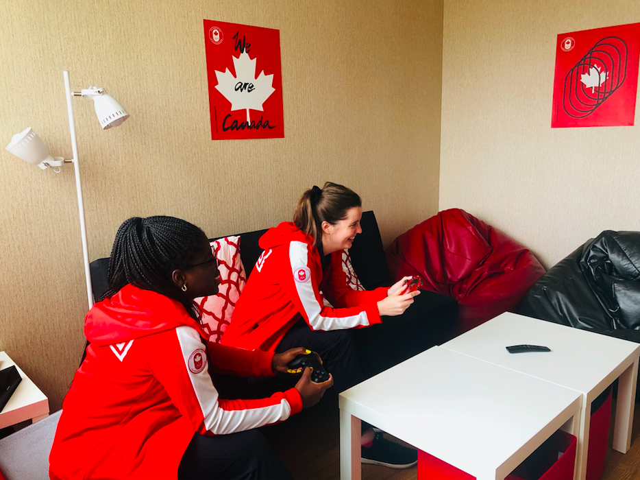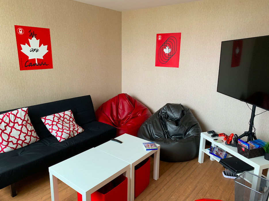 La tour d’appartements où habite Équipe Canada compte plusieurs lieux communs où les athlètes de toutes disciplines peuvent relaxer, jaser, boire leur smoothie protéiné ou même jouer aux jeux vidéos pour pratiquer leurs aptitudes en e-sports.