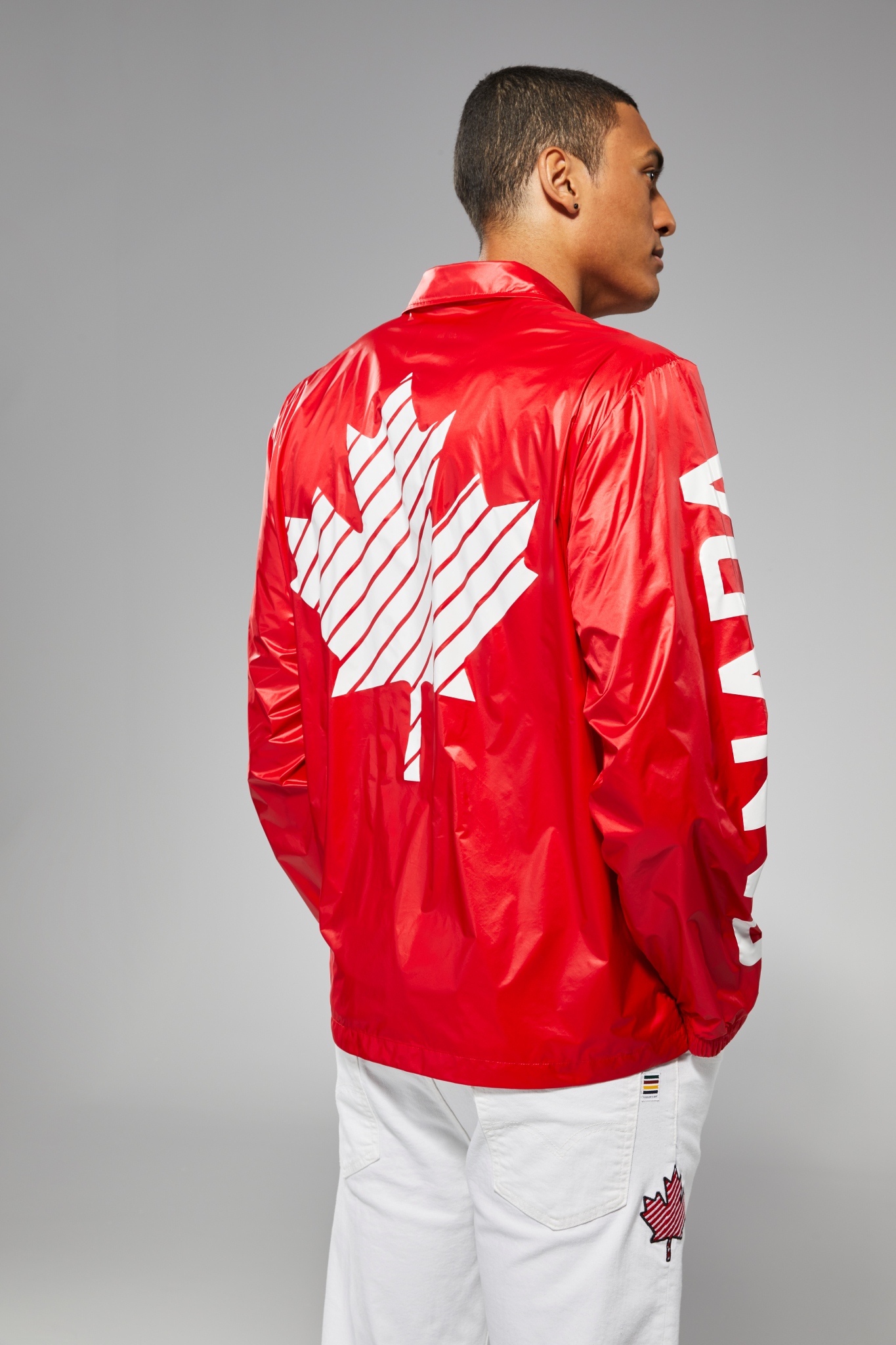 La beauté de l’ensemble se trouve dans les détails. La feuille d’érable est tracée par 13 bandes, représentant l’unité des 10 provinces et trois territoires du Canada. Le veston est fait d’un nylon léger et imperméable, assurant que les athlètes restent au frais et confortables, sous la pluie ou le soleil.