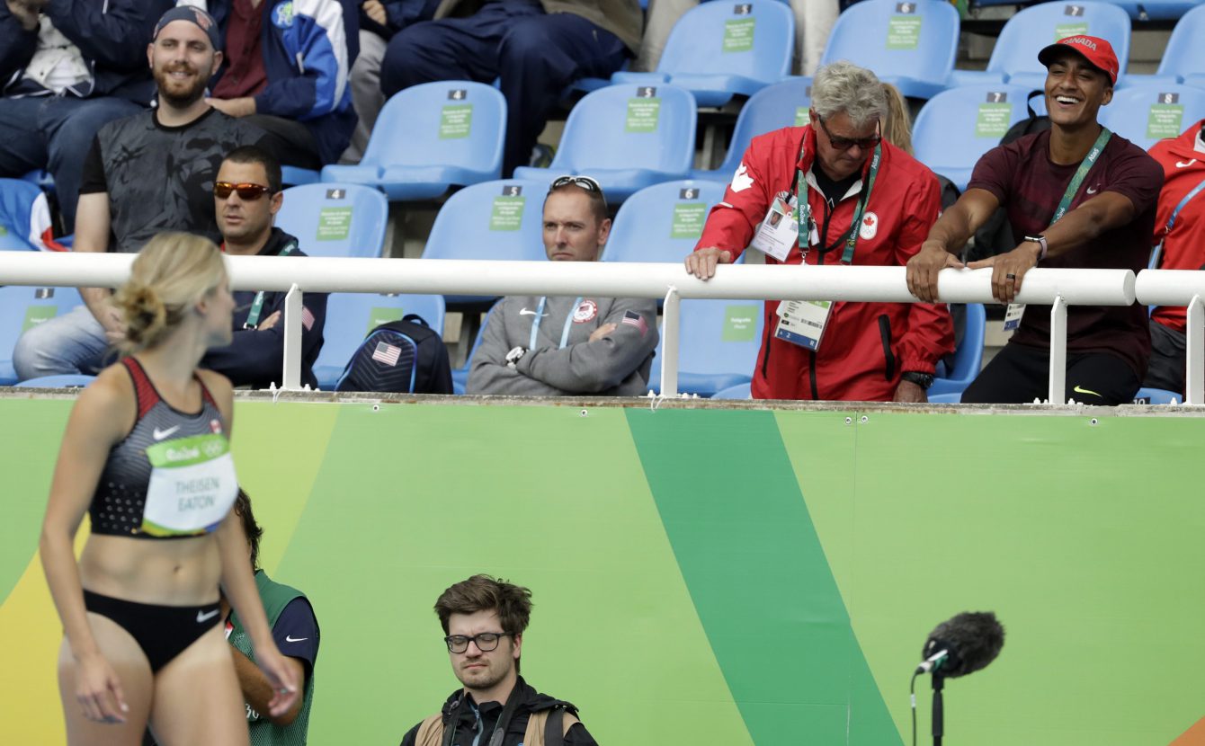 Brianne Theisen Eaton pendant une vague de l’épreuve du saut en hauteur aux Jeux olympiques de Rio 2016, le 12 août. (AP Photo/Matt Slocum)