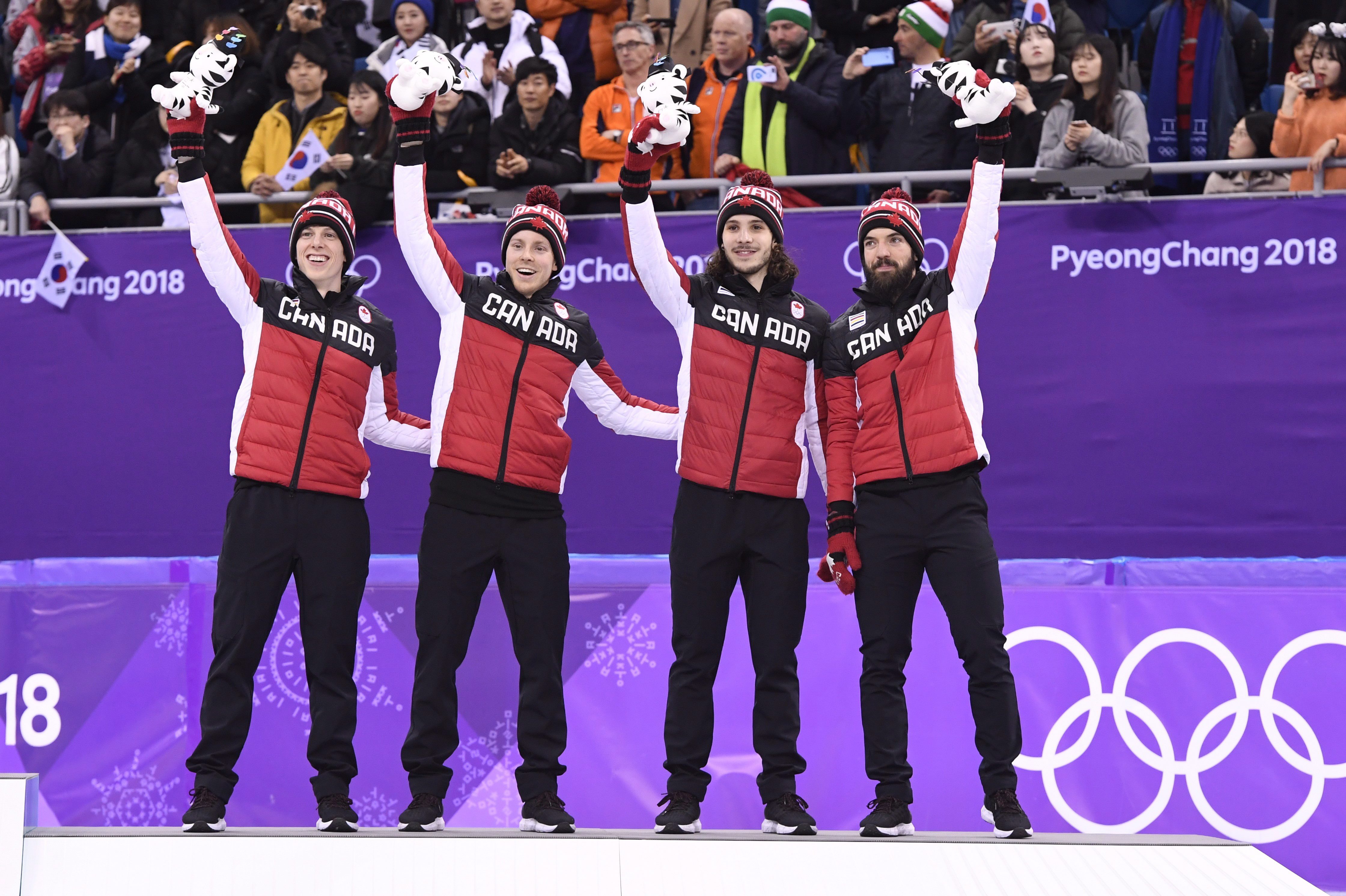L’équipe de patinage de vitesse canadienne célèbre la victoire des hommes au relais 5000 m à PyeongChang, le 22 février 2018. THE CANADIAN PRESS/Paul Chiasson